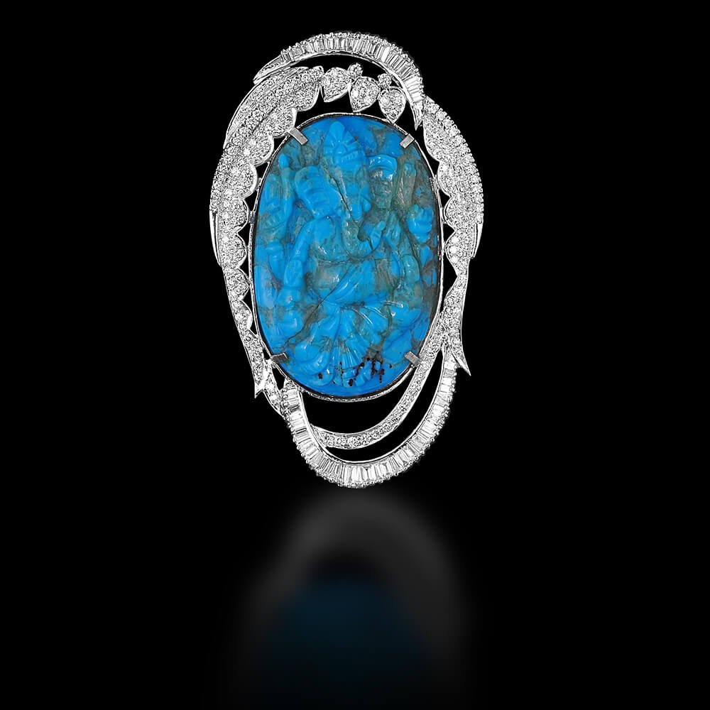 Carved Ganeshji in Turquoise and Diamond Pendant