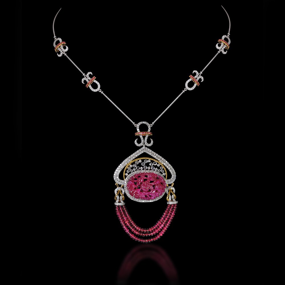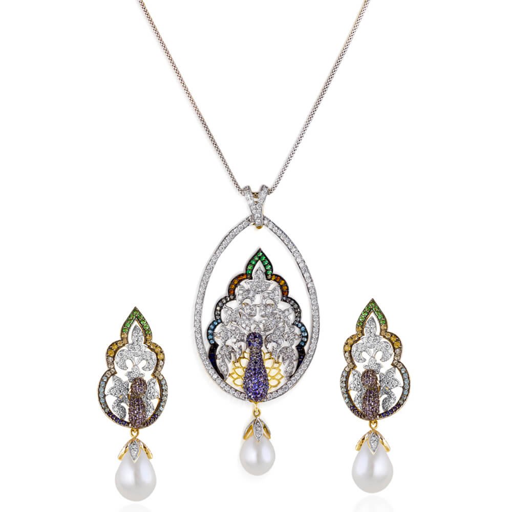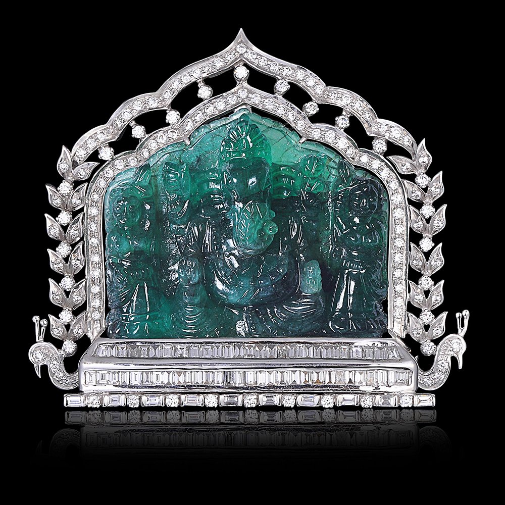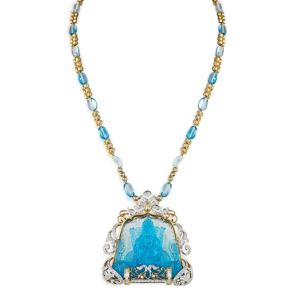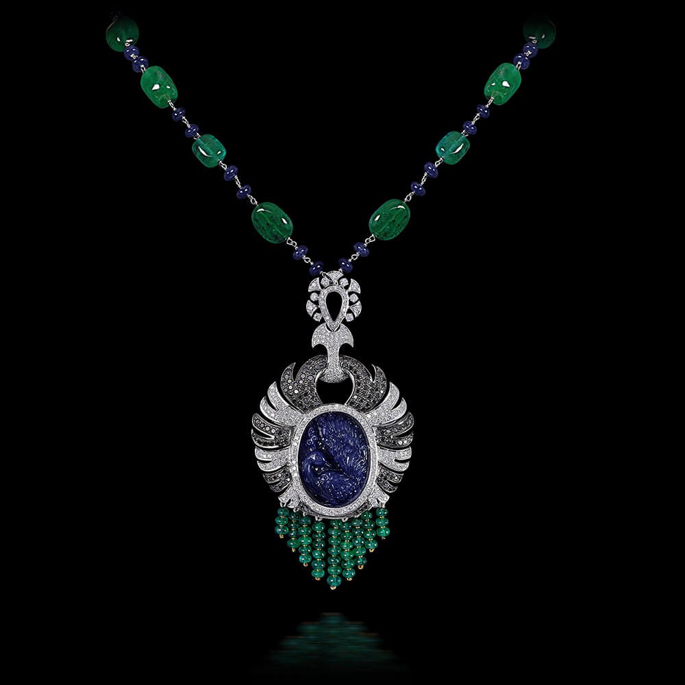 Carved Peacock in Blue Sapphire, Emerald Beads and Diamond Necklace