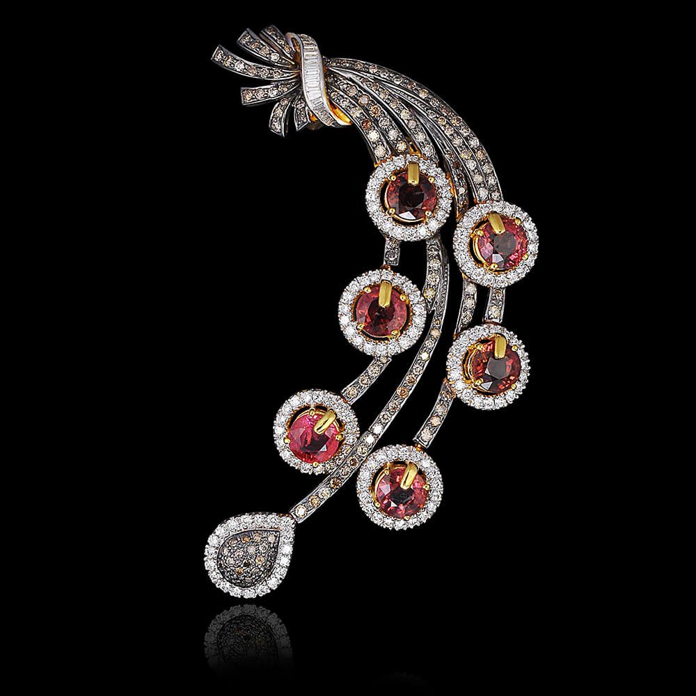 Round cut pink tourmalines, weighing 19.97 carats, adorn this Ma Passion Pendant and Earrings set. The surrounding diamonds weigh 8.44 carats, and the pendant and earring are set, cumulatively, in 50.76 grams of 18K gold.