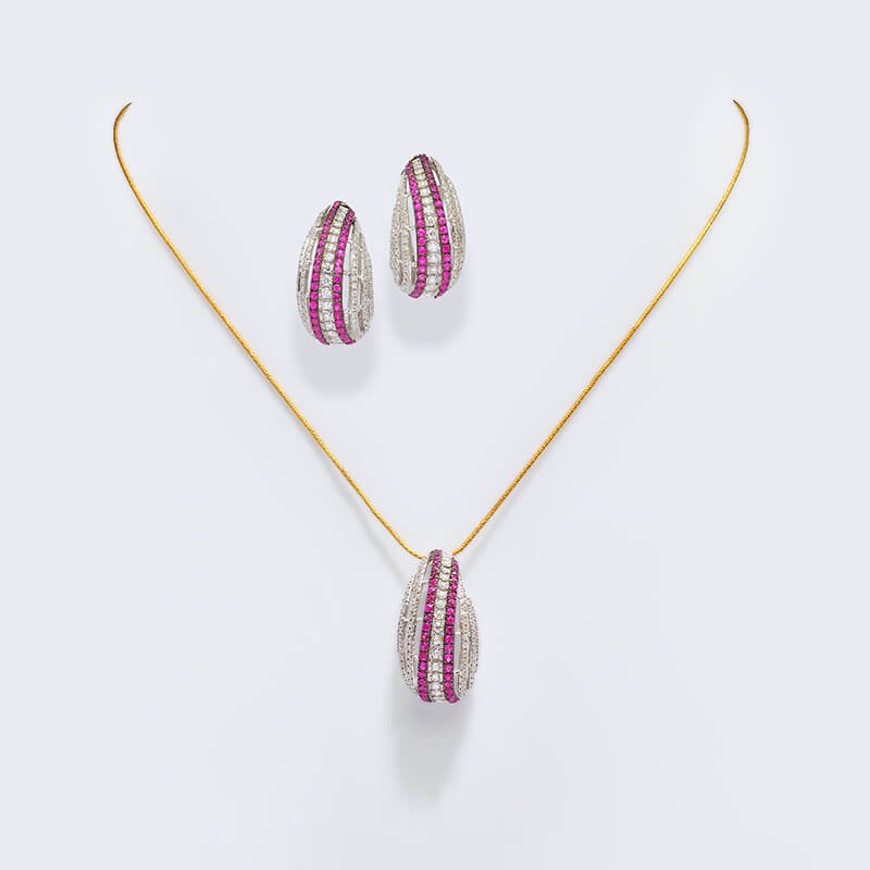 Pink Sapphire and Diamond Pendant and Earrings in Floral Design