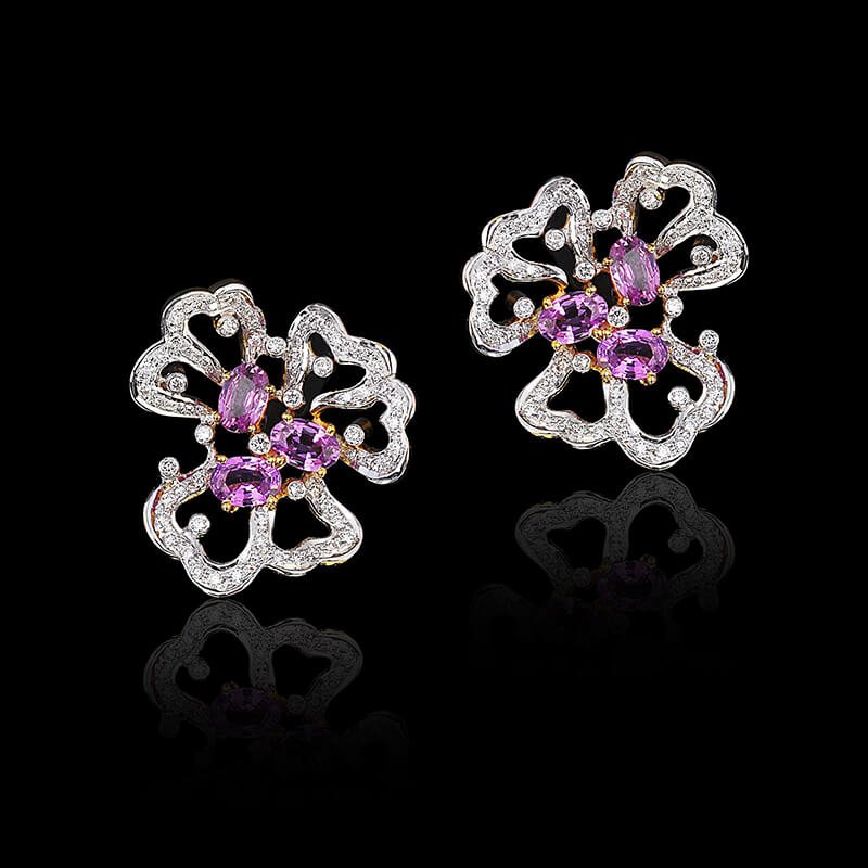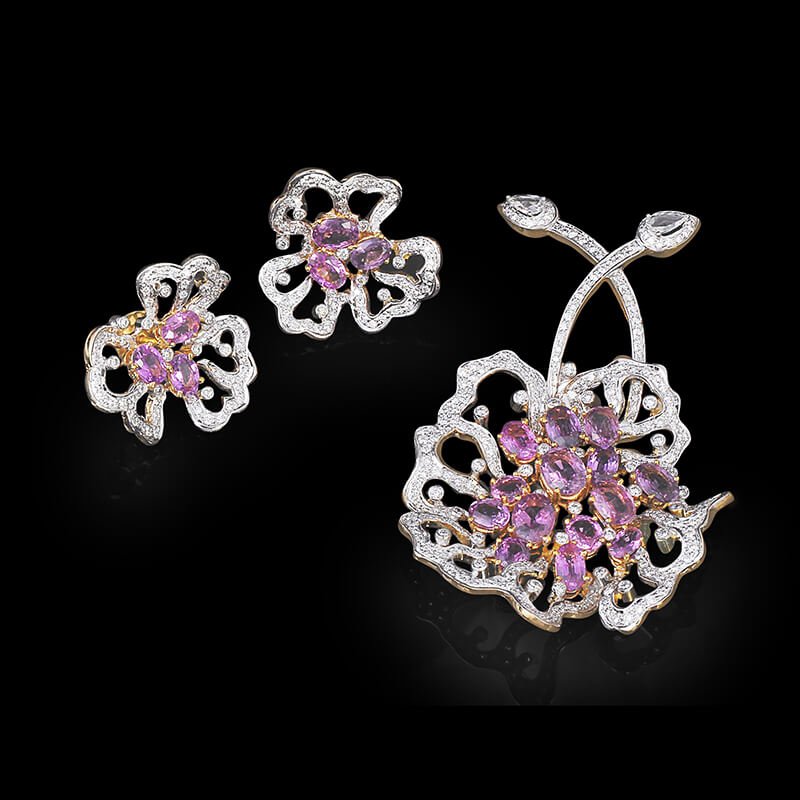 Pink Sapphire and Diamond Pendant and Earrings in Floral Design
