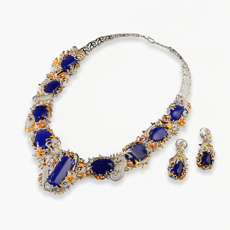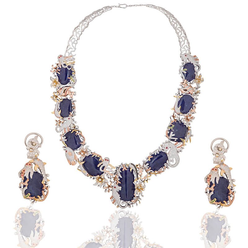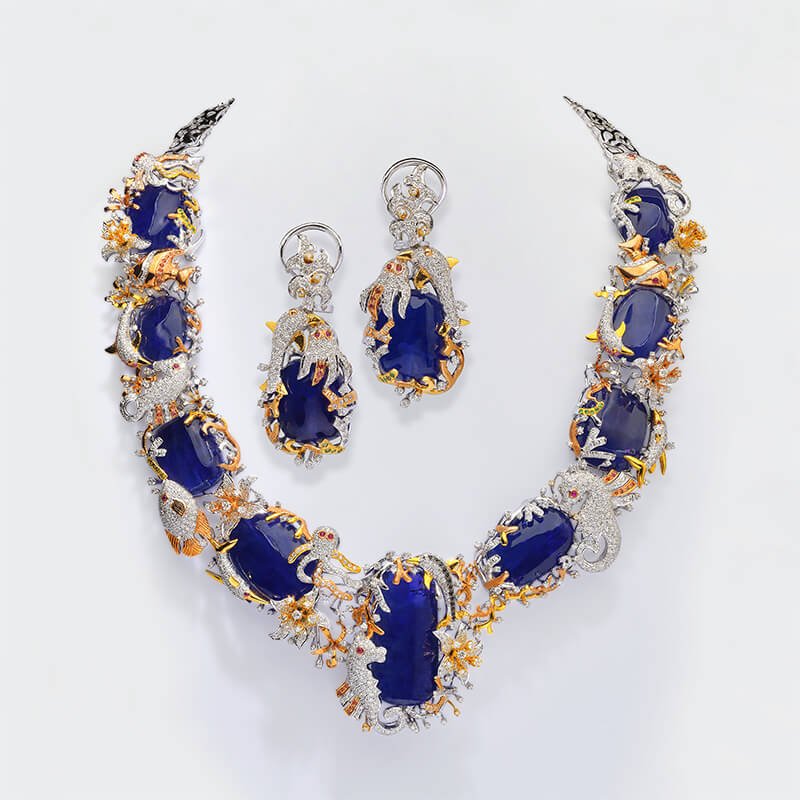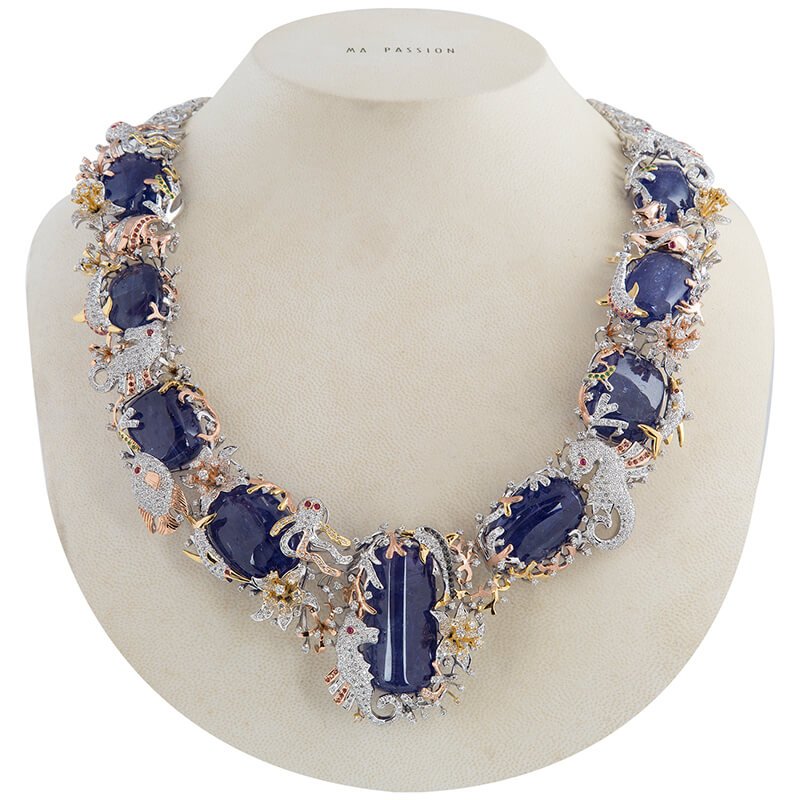 8 beautiful Tanzanite tumbles, weighing a total of approximately 562.57 carats, are encompassed by diamond studded fish, seahorses, dolphins, and octopi in this statement Ma Passion creation. The necklace set in 155.03 grams of 18K gold showcases a mix of gold, white gold, and rose-gold plating to reflect the many hues of the ocean and the deft use of emerald and rubies, along with the 15.18 carats of diamonds, highlight the unique characteristics of the diverse ocean life.