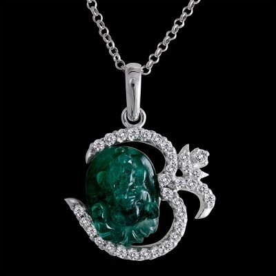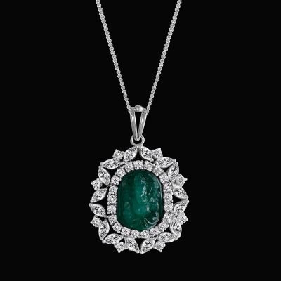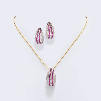 20 oval shaped pink sapphire cut stones, weighing 14.00 carats, adorn this floral pendant and earrings set. The diamonds that outline the flower petals weigh approximately 4.43 carats, and the 18K gold base structure weighs 37.47 grams.