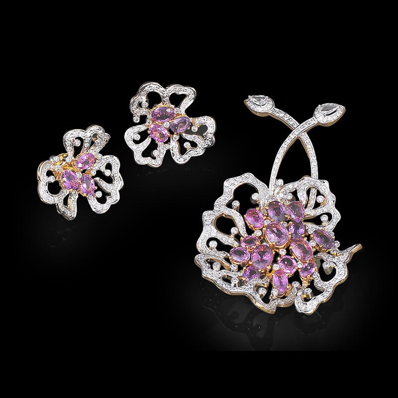 Pink Sapphire and Diamond Pendant and Earrings in Floral Design