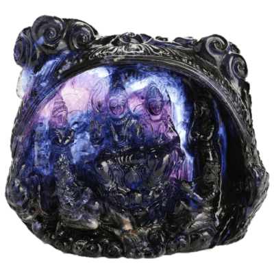 Saraswatiji, Goddess of Knowledge and the Arts is gracefully etched into this exquisite piece of Lapis Lazuli from Afghanistan that is of “AAA” quality. The goddess’ face has soft features, and the surrounding embellishments add to the aesthetic appeal of this one-of-a-kind Ma Passion creation.