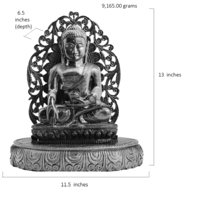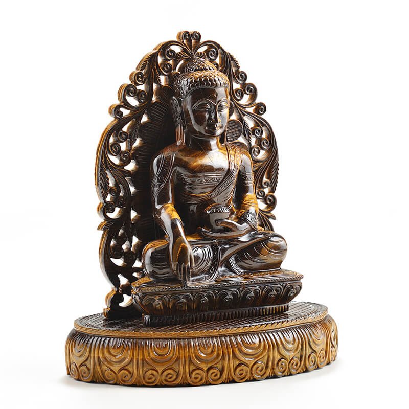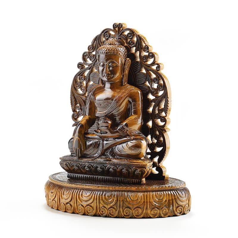 A South-African treasure, Tigereye boasts a charismatic character with its amber and brown bands. The colours react with light in varying ways, making the character of the stone all the more dynamic. The mining of the stone is done in an area that is infamous for being a lion territory, making the procuring of the stone all the more precarious. In this carving, Buddha is seen in a classic pose with His left hand on the lap and the right hand pointing to the ground. This pose represents Buddha’s moment of enlightenment. The accomplished kaarigar has enhanced the greatness of this moment by adding an ornate jaali behind the figure of Buddha. The character of the Tigereye adds a natural glow to the Buddha’s face and body, thereby actualizing the ultimate moment of enlightenment in this creation.
