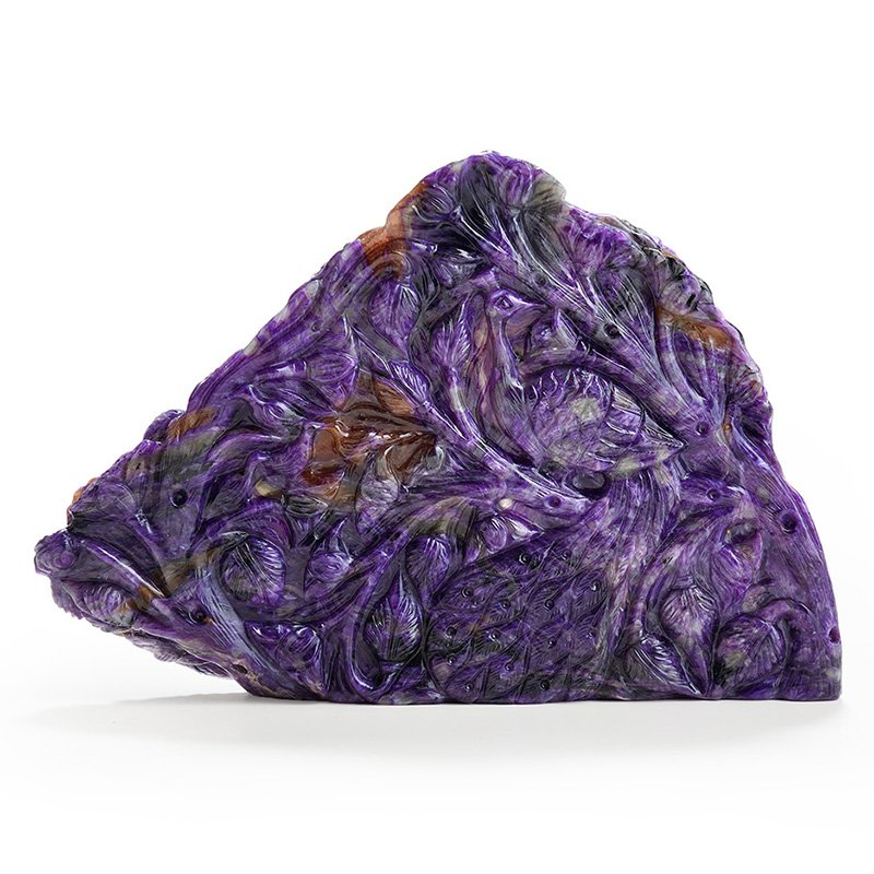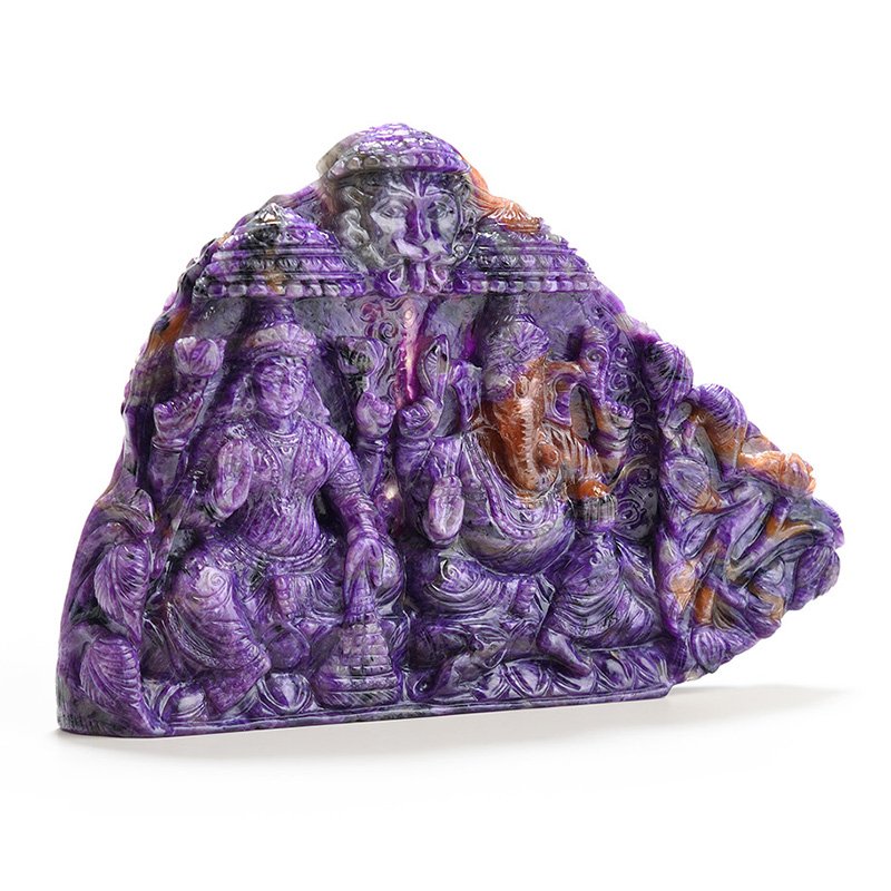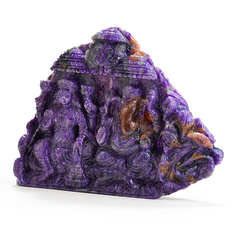 The divine duo of Ganeshji and Laxmiji sit under a South Indian chatri in this Ma Passion creation in Charoite. Sourced from the remote mines of Siberia, Charoite is an incredibly rare treasure that is only found around the Chara River in Russia. Characterized by distinctive lavender swirls, the range of colours can vary even in a single specimen, making each piece unique and rare. This tableau of the Goddess of Wealth and the God of New Beginnings, carefully carved by our master craftsman, is the ultimate connoisseur’s choice.
