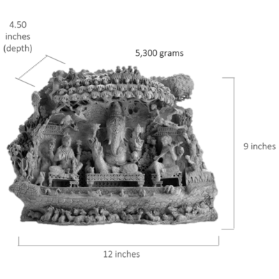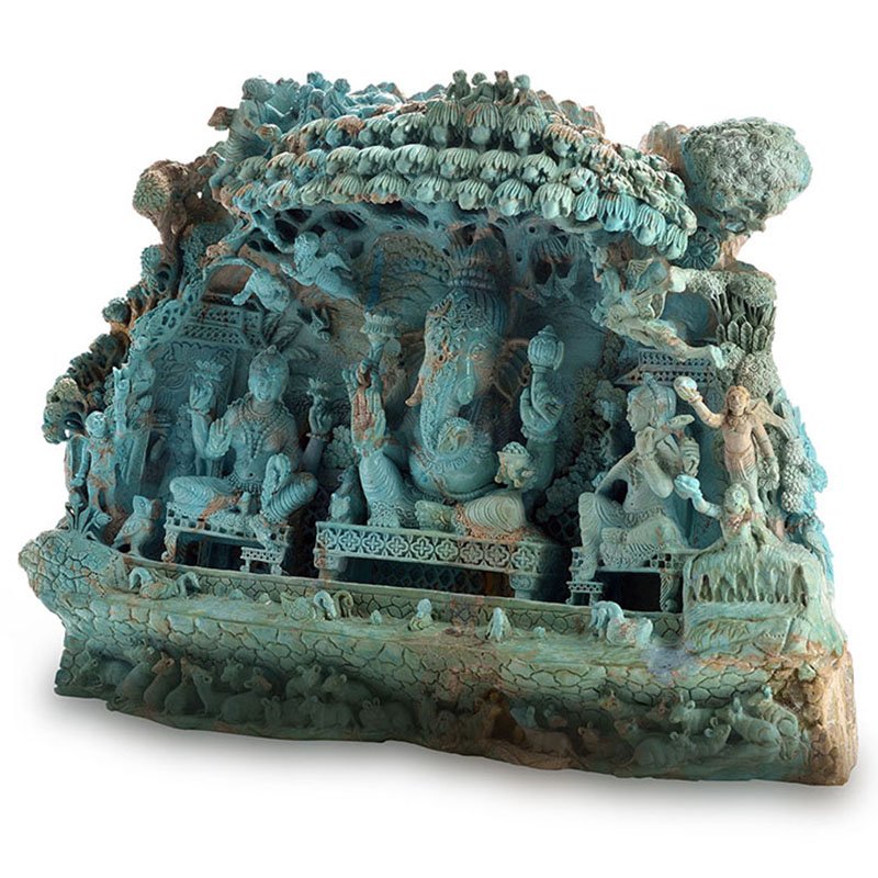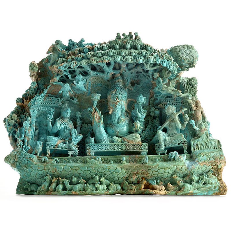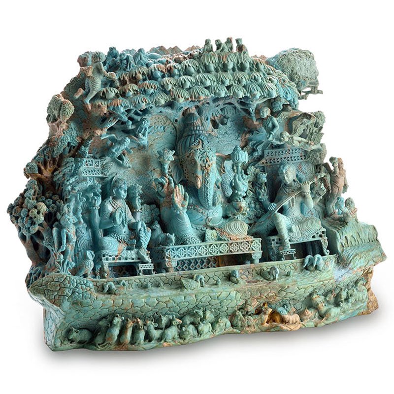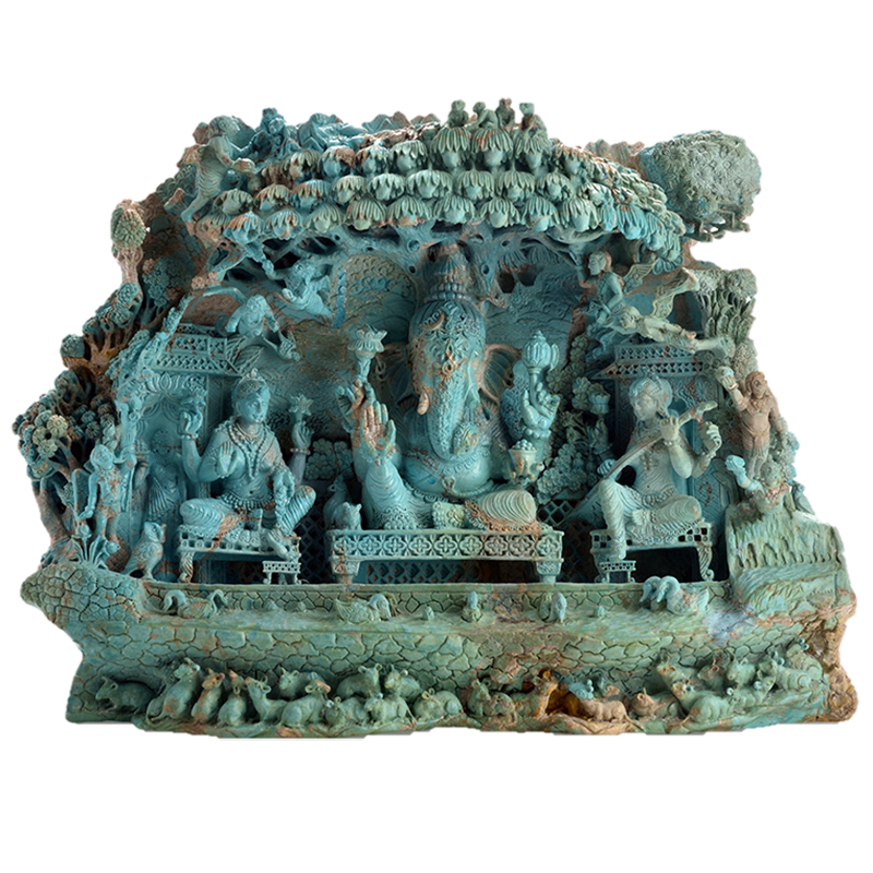 This Ma Passion masterpiece depicts Lord Ganesha in Darbar with Goddesses Laxmiji, and Saraswatiji. Sleeping Beauty turquoise increased in value and rarity after the Arizona mine closed in 2012 and so, this 5.3 kg piece of the exquisite chalky blue stone was difficult for the miner to let go. However, after knowing that the size of the stone would be kept intact – and not broken down to make jewelry – he entrusted the Ma Passion team with his most prized possession. Our oldest and most experienced craftsman envisioned the holy trinity being encompassed by mystical elements and flora and fauna. He brought it to life whilst paying the utmost attention to detail, creating a symbol of timeless beauty that will enrich generations to come.