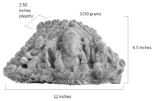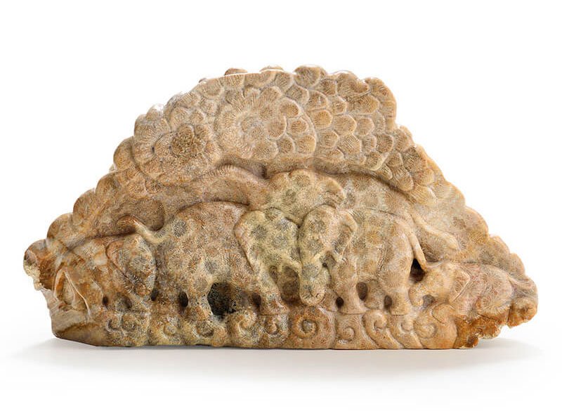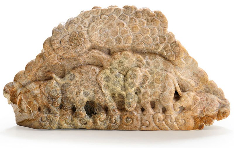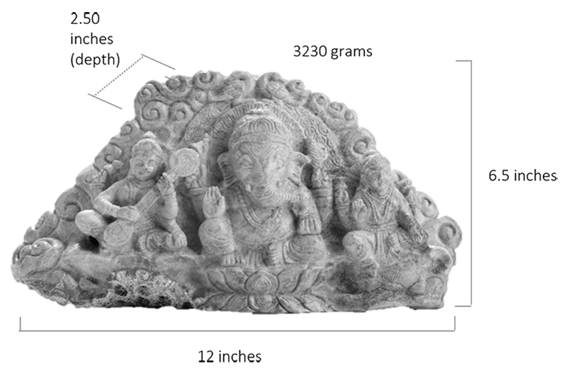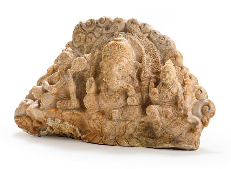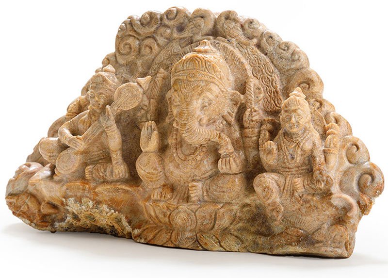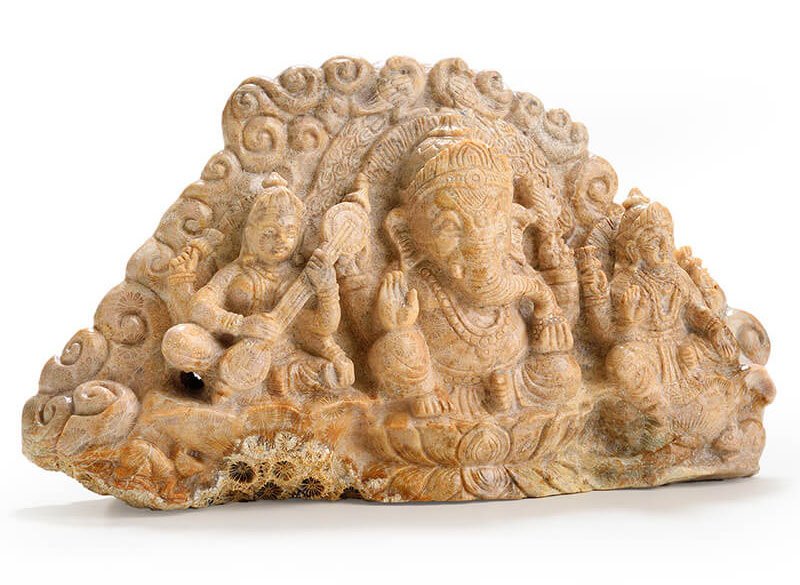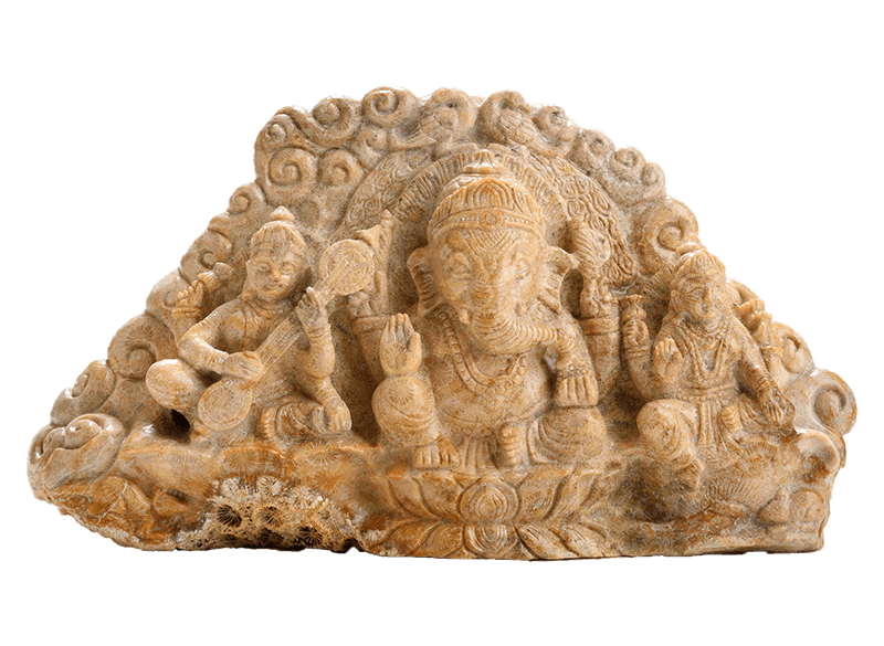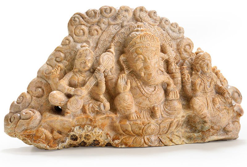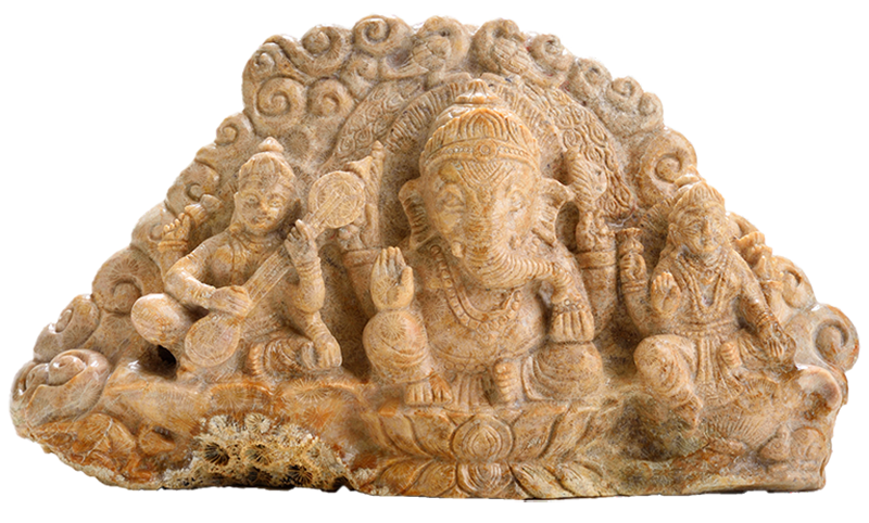 This breathtaking stone comes from the oceans surrounding Indonesia. The repeating web-like patterns are formed when silica from the water replaces ancient buried corals, giving the stone a rich historical context. Our award-winning craftsman was enamoured with the character of this specimen and decided to carve the holy trinity of Ganeshji, Laxmiji, and Saraswatiji into the natural crevices of the stone. The subject of the carving and the symbolic history that the stone represents together make the creation a true collectible; one that can never be seen again.