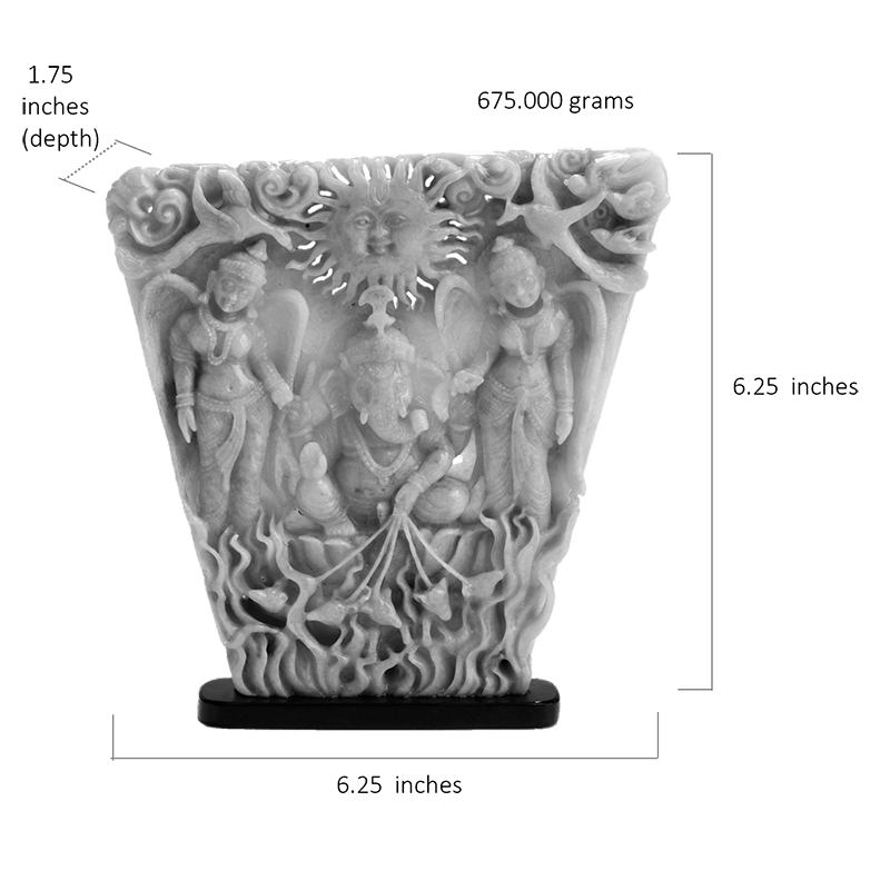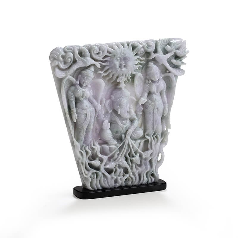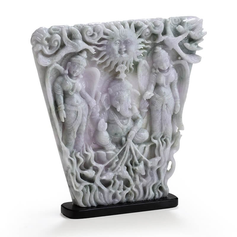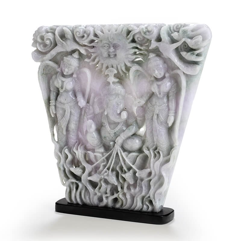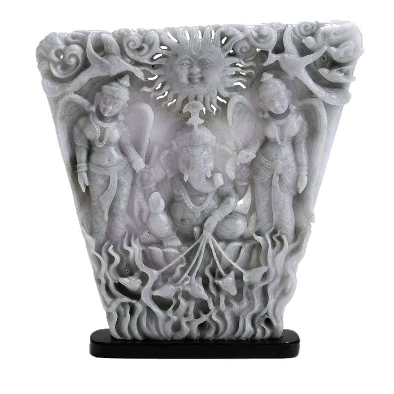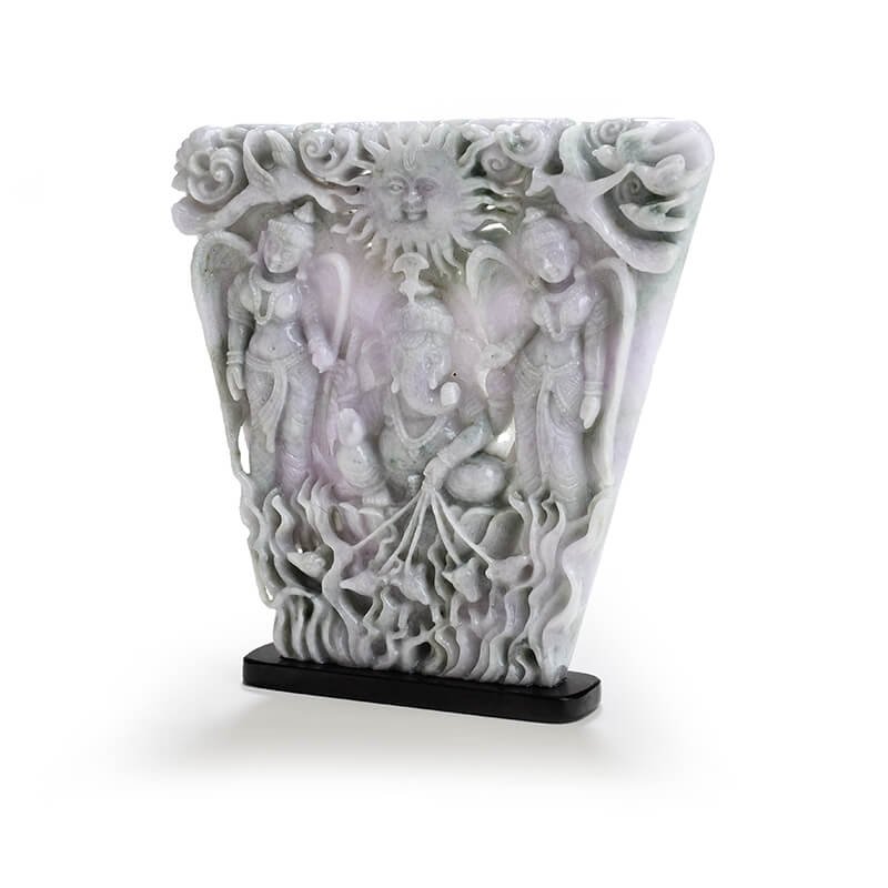 Lord Ganesha with Riddhi Siddhi is carefully carved into this rare piece of Lavender Burmese Jade. The uniqueness of the stone is demonstrated by its rare size and the absence of green and grey inclusions, making it a pure piece of Lavender Jadeite. This creation exemplifies the highest level of detailing with the addition of the birds of paradise on top and the running mice at the bottom. The stone is hollowed out to illustrate the sun’s rays above the God, truly bringing to life the majesty of the Sun God. An epitome of intricate carving, this Ma Passion creation uses the last mile techniques of gemstone carvings to exemplify the best qualities of Burmese Jade.