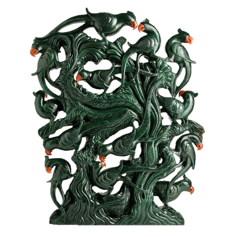 A PANDEMONIUM OF PARROTS IN DARK GREEN AVENTURINE