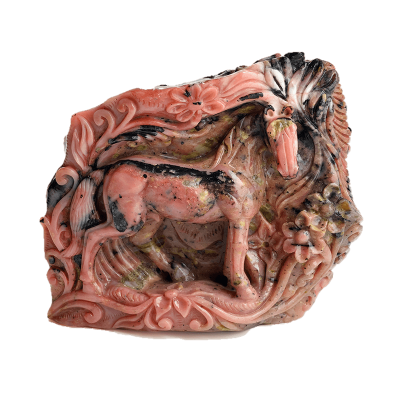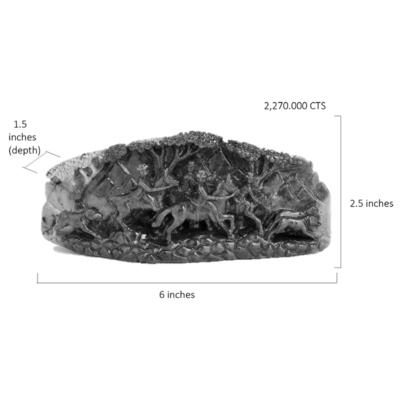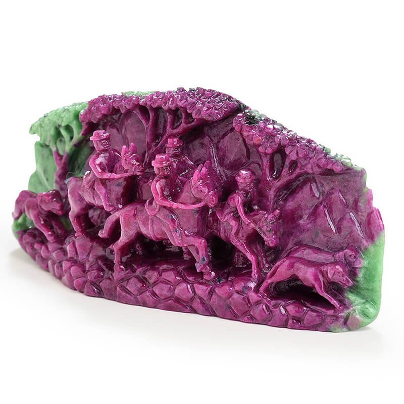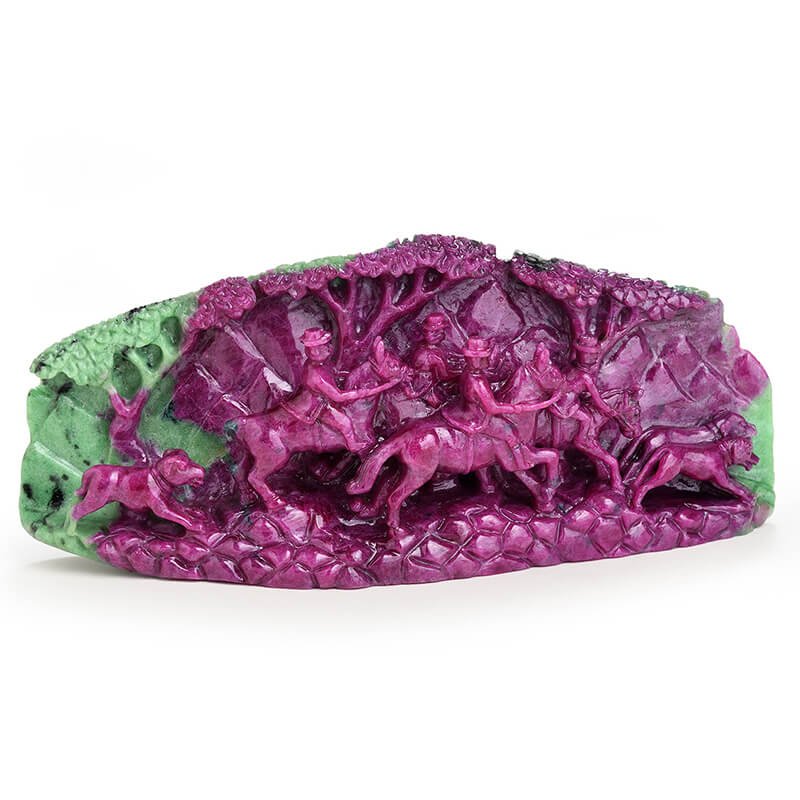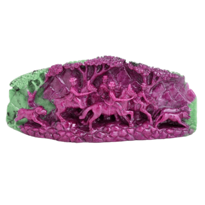 On looking at this singular piece of exquisite Ruby from the Longido Mines in Tanzania, one of our oldest kaarigars was inspired to experiment with his subjects. He wanted to showcase his versatility by challenging himself and choosing a historical subject from another land. After doing some research, he chose the scene of the Duke of Edinburgh, foxhunting with his entourage in Scotland. Showcasing a magnificent polish, this masterpiece is intricate yet bold. One can almost feel the movement of the horses and dogs in that carving; the kaarigar has managed to create motion in stone. This Ma Passion creation is a rarity, both in matter and in form. It never existed before and will never exist again.
