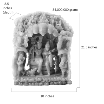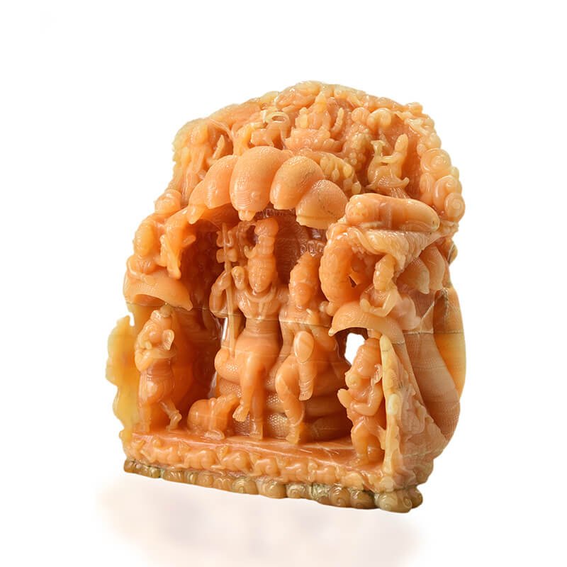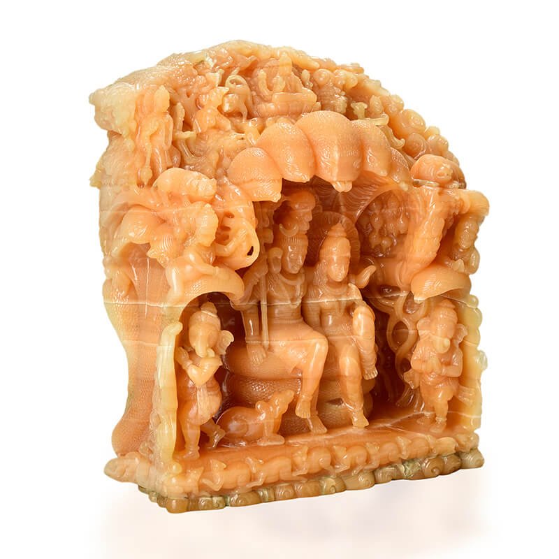 This creation tells a fascinating story about a challenge between two brothers, Ganesha and Kartikeya – sons of Lord Shiva and Goddess Parvati. Lord Shiva had held a competition between his sons in which each of them would have to circle the world three times and the winner would get to eat a special mango that bestowed him with knowledge and wisdom. Without further ado, Kartikeya jumped on his peacock and set out to win the challenge. Meanwhile, Lord Ganesha folded his hands and began walking around his parents. This Ma Passion creation freezes this particular moment in time. Lord Ganesha appears three times in this carving, shown at different points in his parikrama. One can notice Kartikeya on his peacock at the back of the carving as well. With all the Gods watching, Lord Ganesha wins the challenge by proving that his parents are his world. Carved in Orange Calcite from Mexico, this one-of-a-kind masterpiece is a divine story set in stone for eternality.