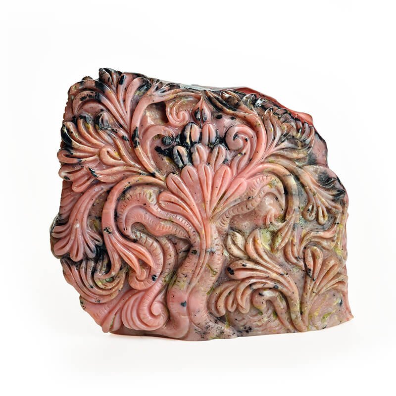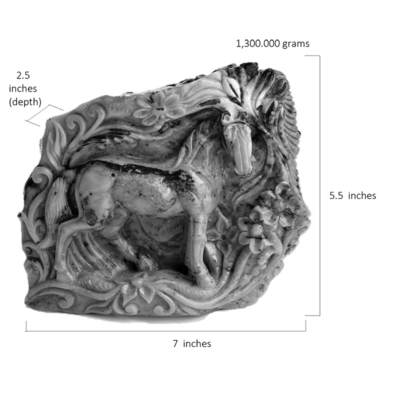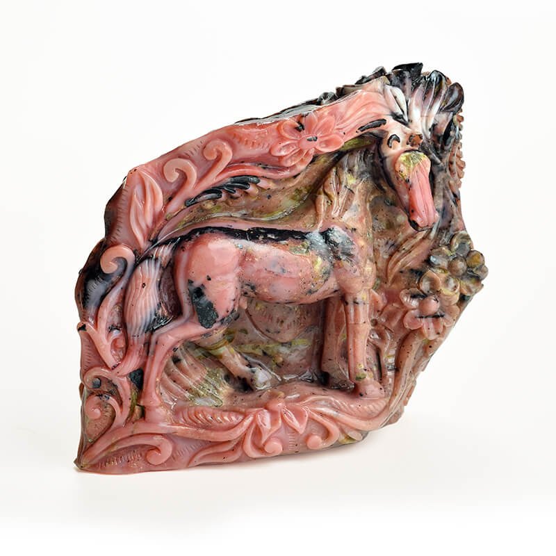 A carving that is pleasing to the eye, this Ma Passion creation is simple yet distinct. The stone is only found in deposits of the Andean mountains in Peru, South America and exhibits a charismatic character; the touch of black and yellow mixed with the pink adds to the uniqueness of the carving. Carved by an artist who specializes in animal figures, this piece highlights a stately and sinewy horse in its natural habitat.