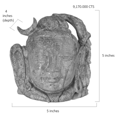 A stone with a dynamic character, this Turkish treasure is a unique gift of nature that exhibits an exquisite lavender colour. The spots of brown add an antique look to this emotive face of Lord Shiva. In this Ma Passion carving, the God of Destruction has a calm face; a quality that can only be achieved in gemstone by a master craftsman. Along with the crescent moon on his head as well as Vasuki, His snake, Lord Shiva is depicted in an unusual avatar in this exquisite creation.