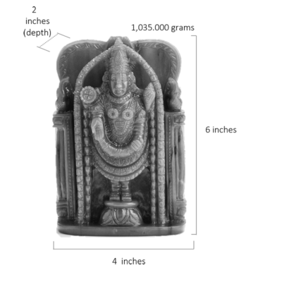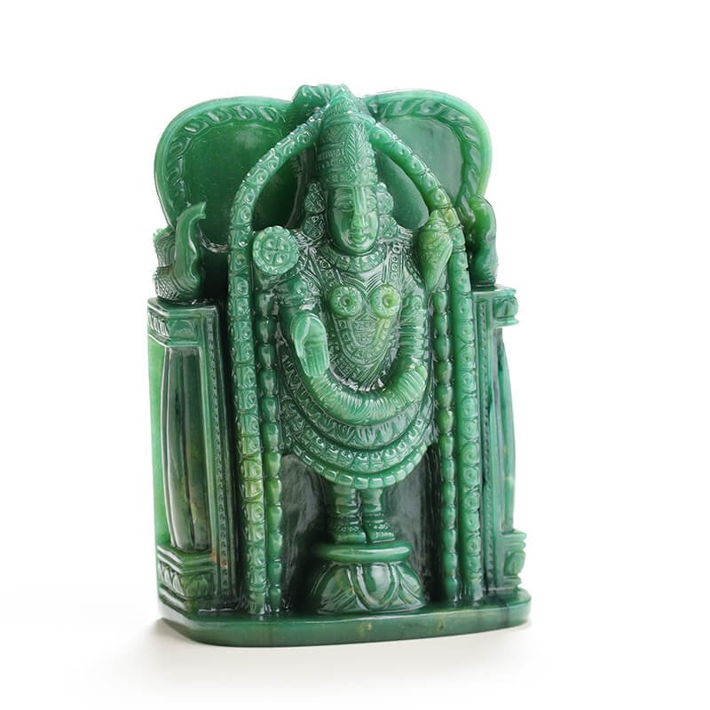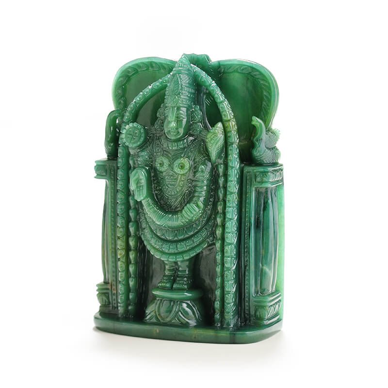 Tirupati Balaji, a form of the Lord Vishnu, is perfectly carved in this exquisite piece of African Green Quartz. The symmetry of this carving is spot on – depicting Lord Vishnu in this avatar perfectly. The uniqueness of this carving is amplified given that only a few gemstone carvers can make this form of Lord Vishnu. The clarity of the craftsmanship and the exquisite polish of the stone make this carving an absolute visual delight.