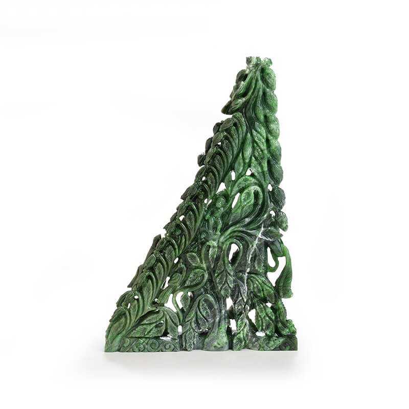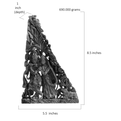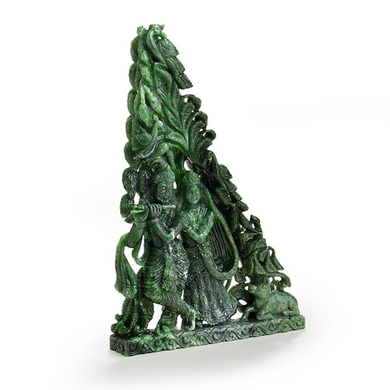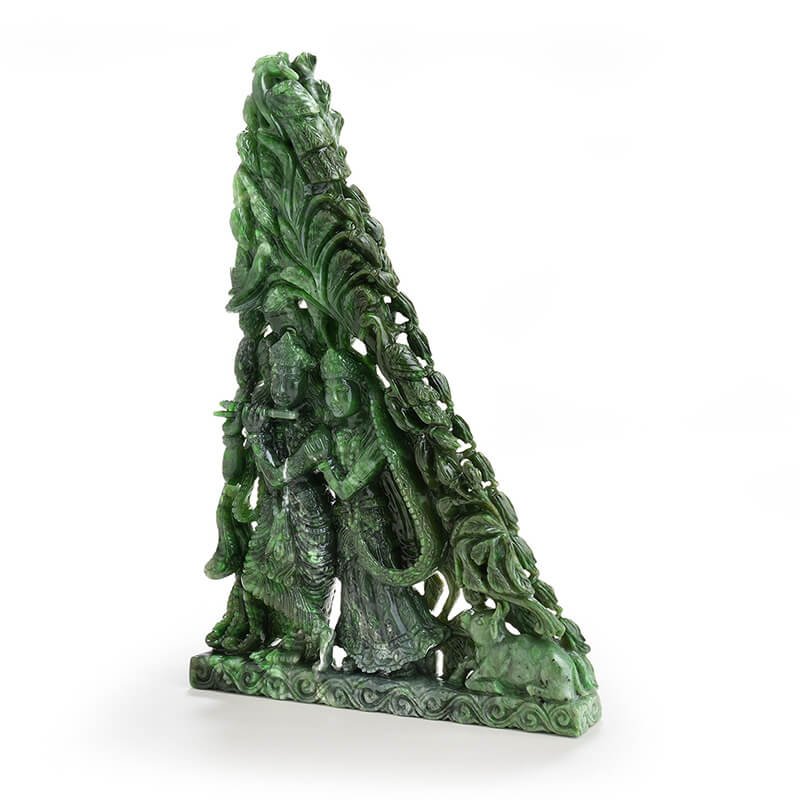 Bought from a dear friend who spends most of the year mining in the Yukon territory in Northwest Canada, this rich-green piece of Yukon Jade is masterfully carved to eternalize the love of Radhakrishna in their symbolic pose. The intricacy of the doddi work on the leaves and trees surrounding the divine couple is the result of hours of patience and dedication. The clarity of each fold in the Gods’ garments and each jewel in their ornaments is a testament to the skillfulness of the kaarigar. The triangular shape of the mother stone was retained to create a one-of-a-kind masterpiece in this ancient stone of luck and good fortune.