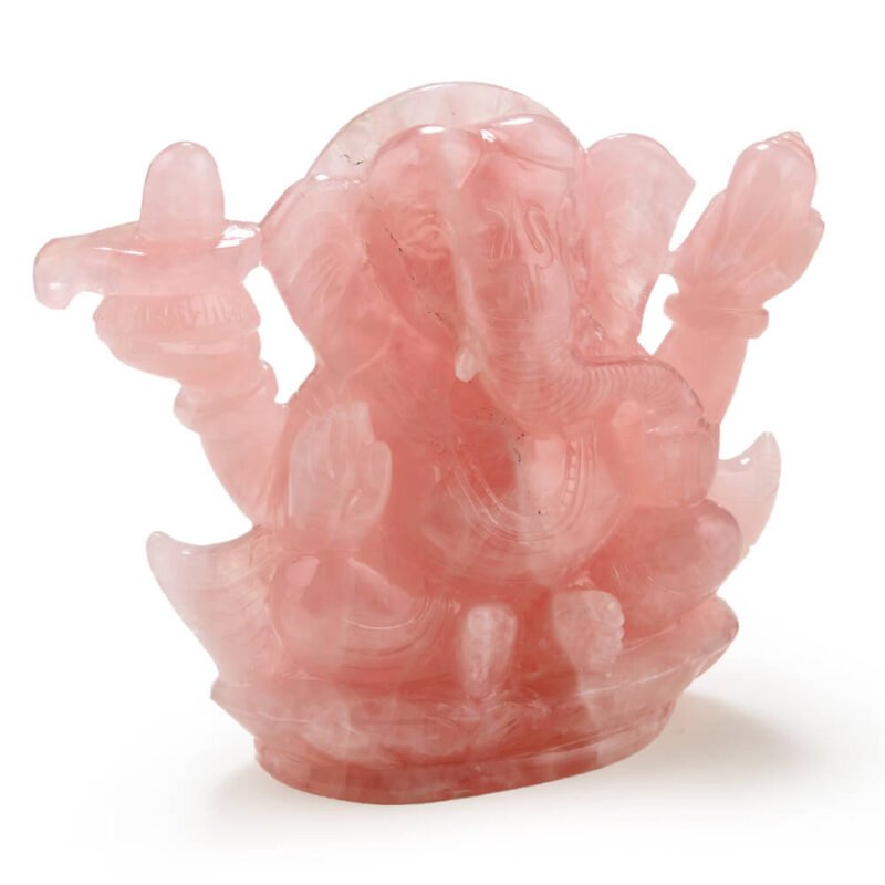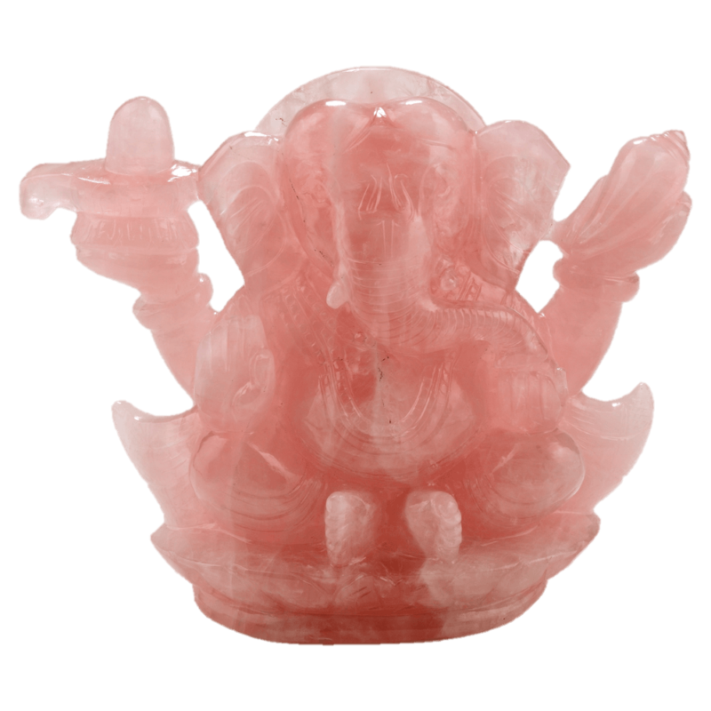With the addition of the shivling and shankh in Lord Ganesha’s hands, this Ma Passion creation presents the God in a unique avatar. The shivling alludes to Ganeshji’s father, Lord Shiva, whilst the shankh is a sacred emblem of Lord Vishnu. Carved in the stone of Unconditional Love, this Rose Quartz carving is a classic combination of beauty, art, and the divine.